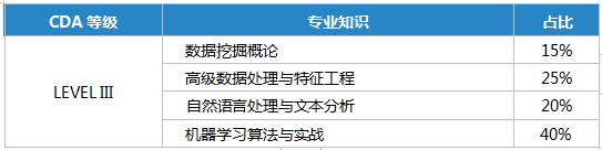 CDA Level III 包含以下科目:《數(shù)據(jù)挖掘與高級(jí)數(shù)據(jù)處理》、《自然語(yǔ)言處理與文本分析》、《算法應(yīng)用與實(shí)戰(zhàn)》