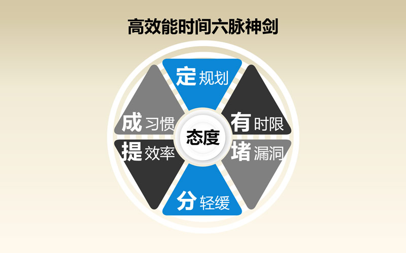 一、定規(guī)劃 1.做正確的事 2.正確地做事 案例分析:職業(yè)成就始于規(guī)劃 二、有時限 案例分析:德魯克的時間管理案例 一位集團總裁的時間管理 三、堵漏洞 1.排干擾 (1)學會借力 (2)學會說“不” 案例分析:拒絕的藝術(shù) (3)學會授權(quán) 案例分析:從諸葛亮的事無巨細說起 2.抓空閑 案例分析:休息是為了更好地工作 飯后收拾和打掃是醒腦的時間 馬桶上的閱讀時光 3.統(tǒng)一用 案例分析:個人時間使用的細節(jié)分析 案例分析:這個時候我干啥? 四、分輕緩 1.工作效能分析四象限法 案例分析:統(tǒng)籌方法的運用:日常工作事項分析 永遠完不成的事項清單 頭腦風暴:尋找“不辦事項” 工具實戰(zhàn):怎么做周計劃、日計劃? 2.二八法則 案例分析:丟了西瓜撿芝麻 什么都舍不得丟,那只會丟了時間。 五、提效率 1.要事第一 2.有效授權(quán) 3.高效工具 (1)科學化分配 案例分析:人體生物節(jié)律表 (2)結(jié)構(gòu)化思考 案例分析:一圖勝千言(空序與時序) (3)流程化操作 工具運用:YCYA執(zhí)行系統(tǒng) 最新的第4代流程圖示分享 某集團OA流程實例分享 (4)工具化落地 案例分析:免費的時間管理工具 WBS(工作分解結(jié)構(gòu))五步法 4.拒絕拖延 5.整理整頓 (1)清理桌面 (2)清理電腦 (3)清理居室 案例分析:5S現(xiàn)場管理法的運用 6.安靜時間 案例分析:對高效的誤讀:高效率的五個不等式 高效思維帶來高附加值 六、成習慣