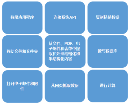 RPA機(jī)器人能夠模仿大多數(shù)人類用戶的行為。它們能夠登錄應(yīng)用程序、移動(dòng)文件和文件夾、復(fù)制和粘貼數(shù)據(jù)、填寫表單、從文檔中提取結(jié)構(gòu)化和半結(jié)構(gòu)化數(shù)據(jù)、抓取瀏覽器等。