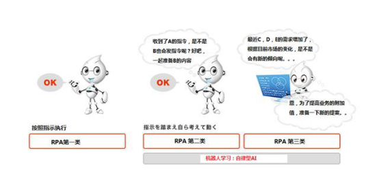 RPA分為三個(gè)類別,其中第二類和第三類是機(jī)器學(xué)習(xí),也就是所謂的自律型AI。據(jù)說完全按照指示執(zhí)行動(dòng)作的機(jī)器人是RPA的第一類,能夠靈活地對(duì)應(yīng)于變化并且能夠自己思考的機(jī)器人是RPA的第二類或第三類,從概念上來講RPA是包含AI在內(nèi)的。
