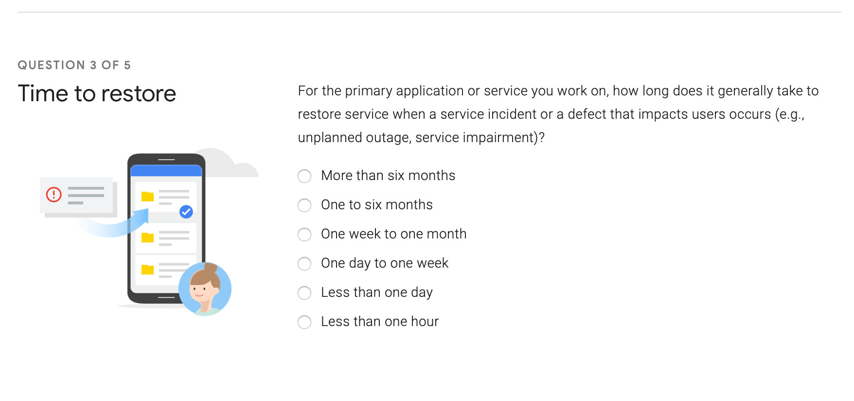 穩(wěn)定性–服務(wù)恢復(fù)時(shí)間: 對于您工作的主要應(yīng)用程序或服務(wù),當(dāng)服務(wù)中斷或出現(xiàn)影響用戶Bug時(shí)(如:計(jì)劃外中斷、服務(wù)受損),恢復(fù)服務(wù)通常需要的時(shí)間。調(diào)查這個(gè)指標(biāo)的問題見2019年加速度DevOps狀態(tài)調(diào)查問卷中的第二部分的第四題。