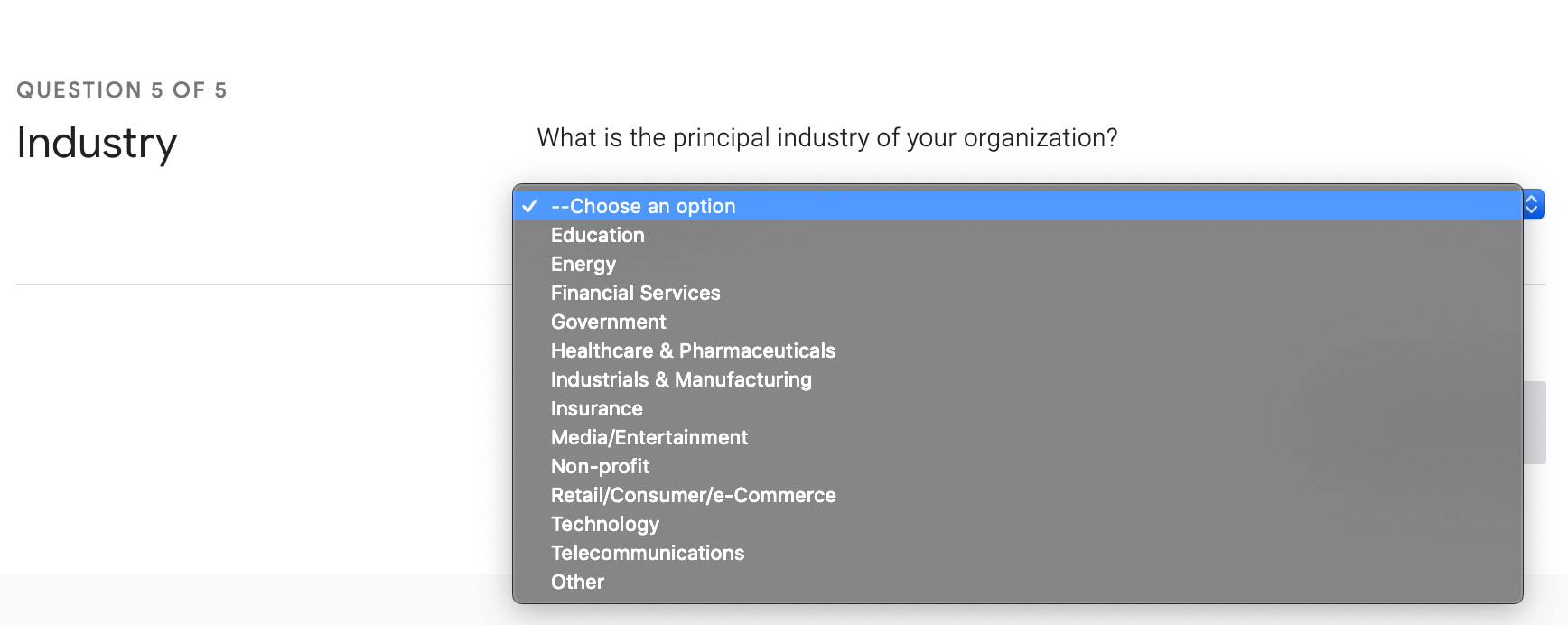 這可能是Google收編DORA團(tuán)隊(duì)所買到的最有價(jià)值的一部分資產(chǎn),歷年來的DevOps調(diào)查問卷參與者的問卷答案數(shù)據(jù)庫。Google今年將這個(gè)數(shù)據(jù)庫向公眾開放了,網(wǎng)址在 https://beta.devops-research.com/performance.html (這個(gè)網(wǎng)址應(yīng)該不用科學(xué)上網(wǎng),會(huì)出現(xiàn)證書錯(cuò)誤提示,請忽略繼續(xù)訪問該頁面)。在你回答了下面的五個(gè)問題后,就可以獲得一份自己的行業(yè)基準(zhǔn)測試報(bào)告。