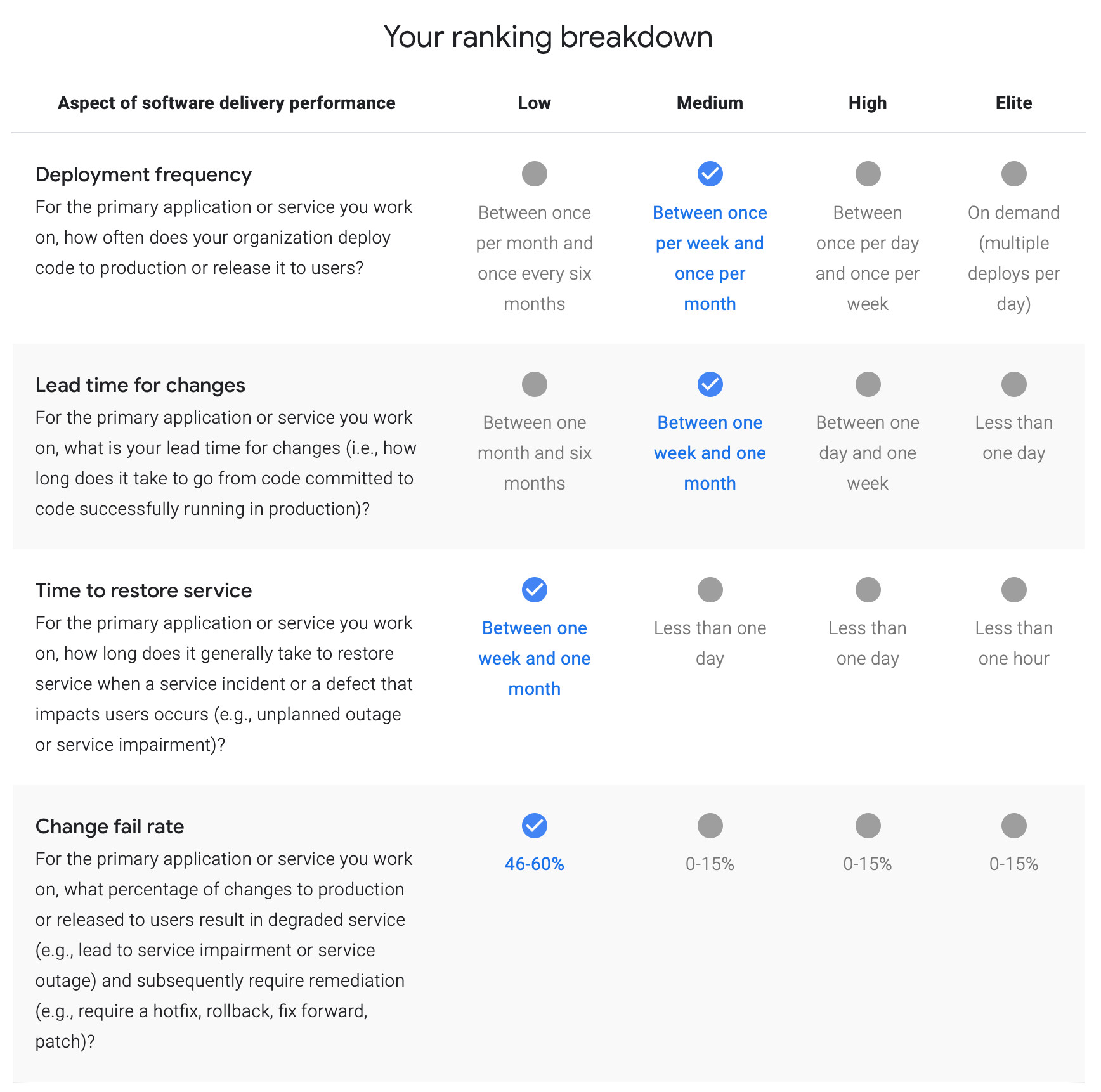 下圖是四個(gè)黃金指標(biāo)在四個(gè)表現(xiàn)級別/集團(tuán)上的度量;表明你每個(gè)指標(biāo)處于哪個(gè)等級。