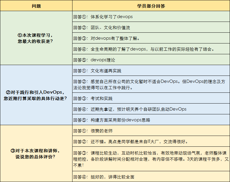 經(jīng)過 3 天的課程培訓(xùn),學(xué)員們對(duì)DevOps有了全新、系統(tǒng)的認(rèn)知,對(duì)于如何將課堂所學(xué)知識(shí)運(yùn)用于實(shí)際工作起到了較好的指引作用。