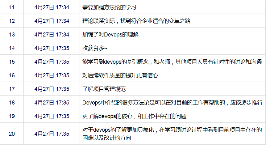 經(jīng)過(guò) 2 天的課程培訓(xùn),學(xué)員們對(duì)DevOps有了全新的系統(tǒng)的認(rèn)知,對(duì)于如何融于到實(shí)際的工作中起到了比較好的指引作用,能夠清晰地找到自己準(zhǔn)確的定位;我們也能夠感受到公司自上而下對(duì)DevOps轉(zhuǎn)型的決心與力度,真心希望通過(guò)這次DevOps的系列培訓(xùn)后,能夠幫助到大家,助力企業(yè)成功轉(zhuǎn)型。